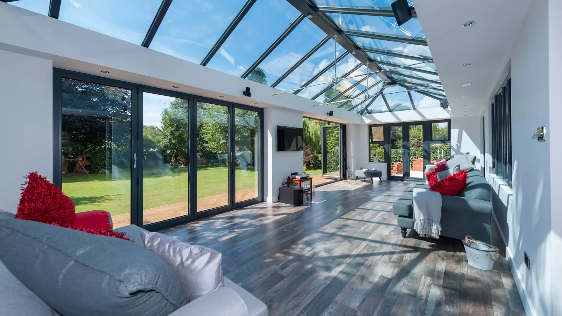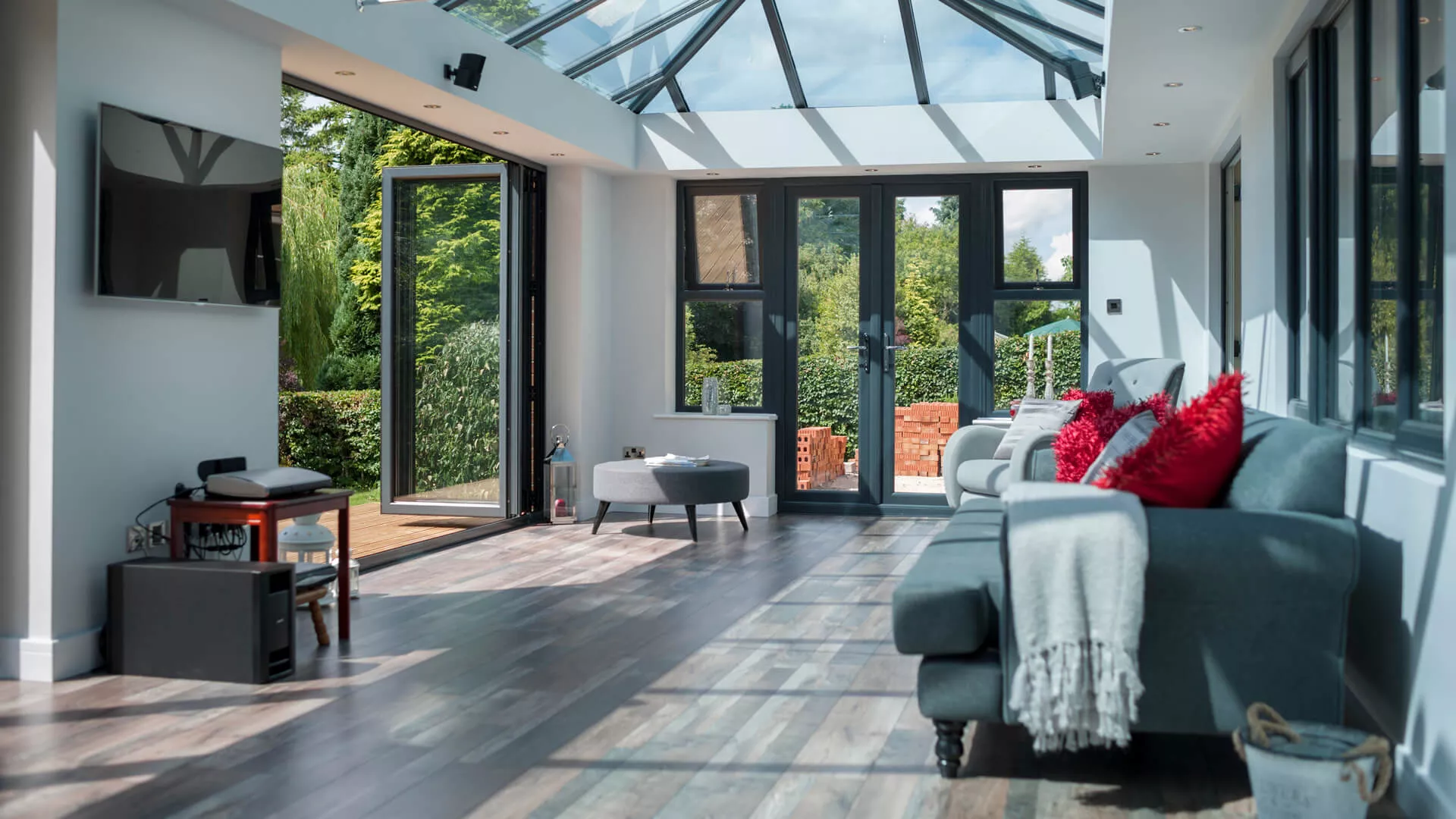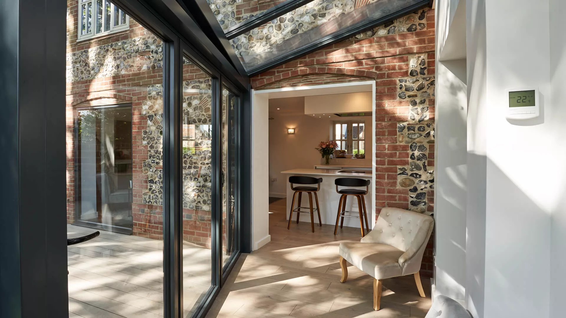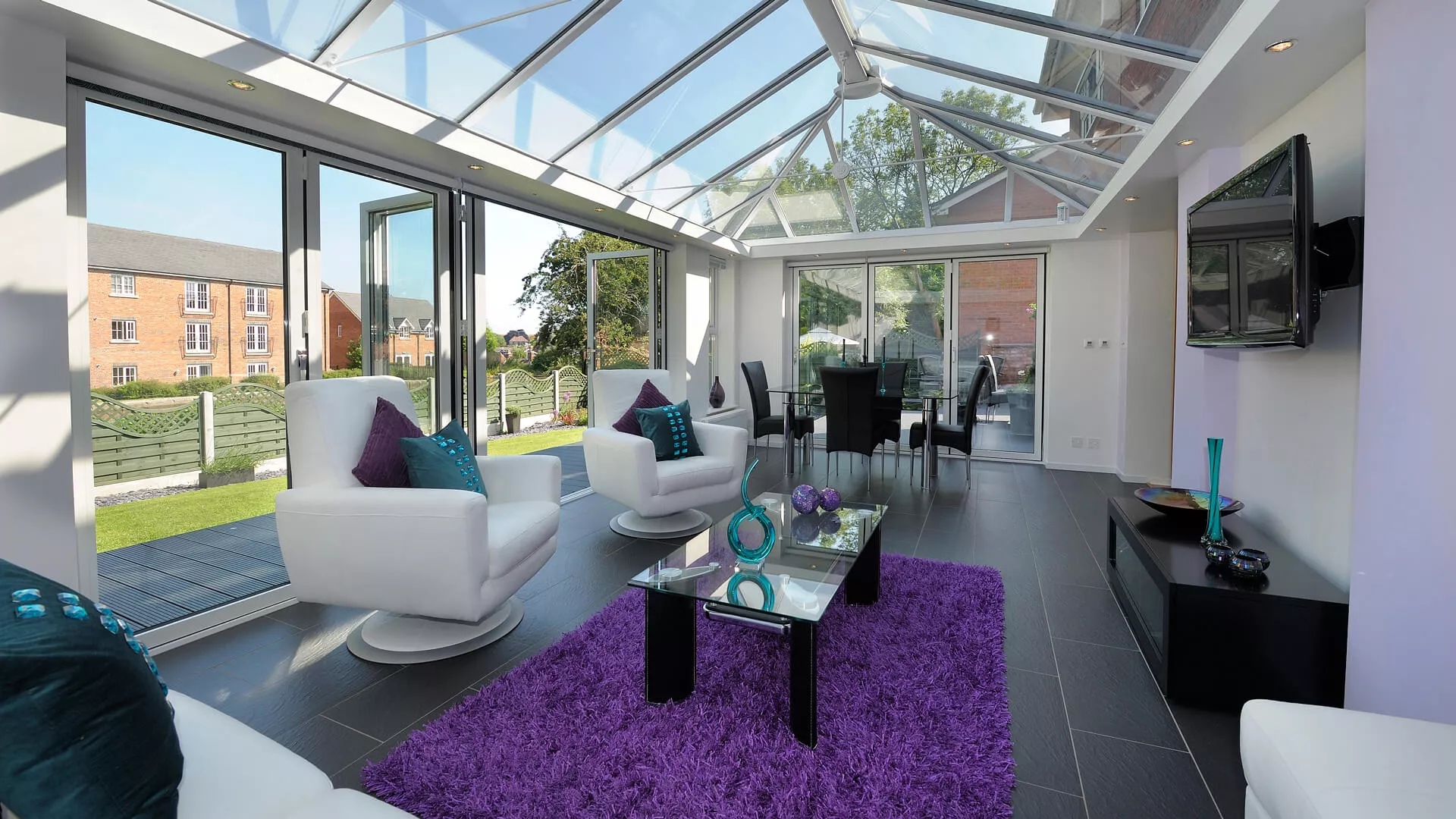 Our ‘Intelligent’ glazing creates a room for all seasons; this high performance glass reflects unwanted heat back out in the summer and welcomes warmth back in during the winter.