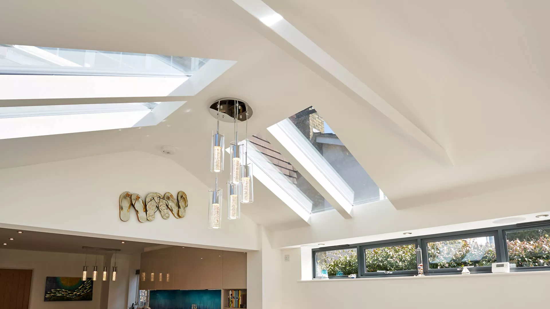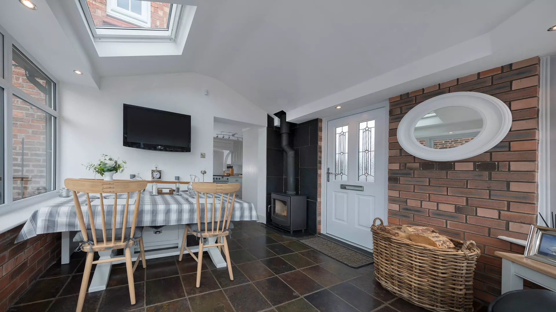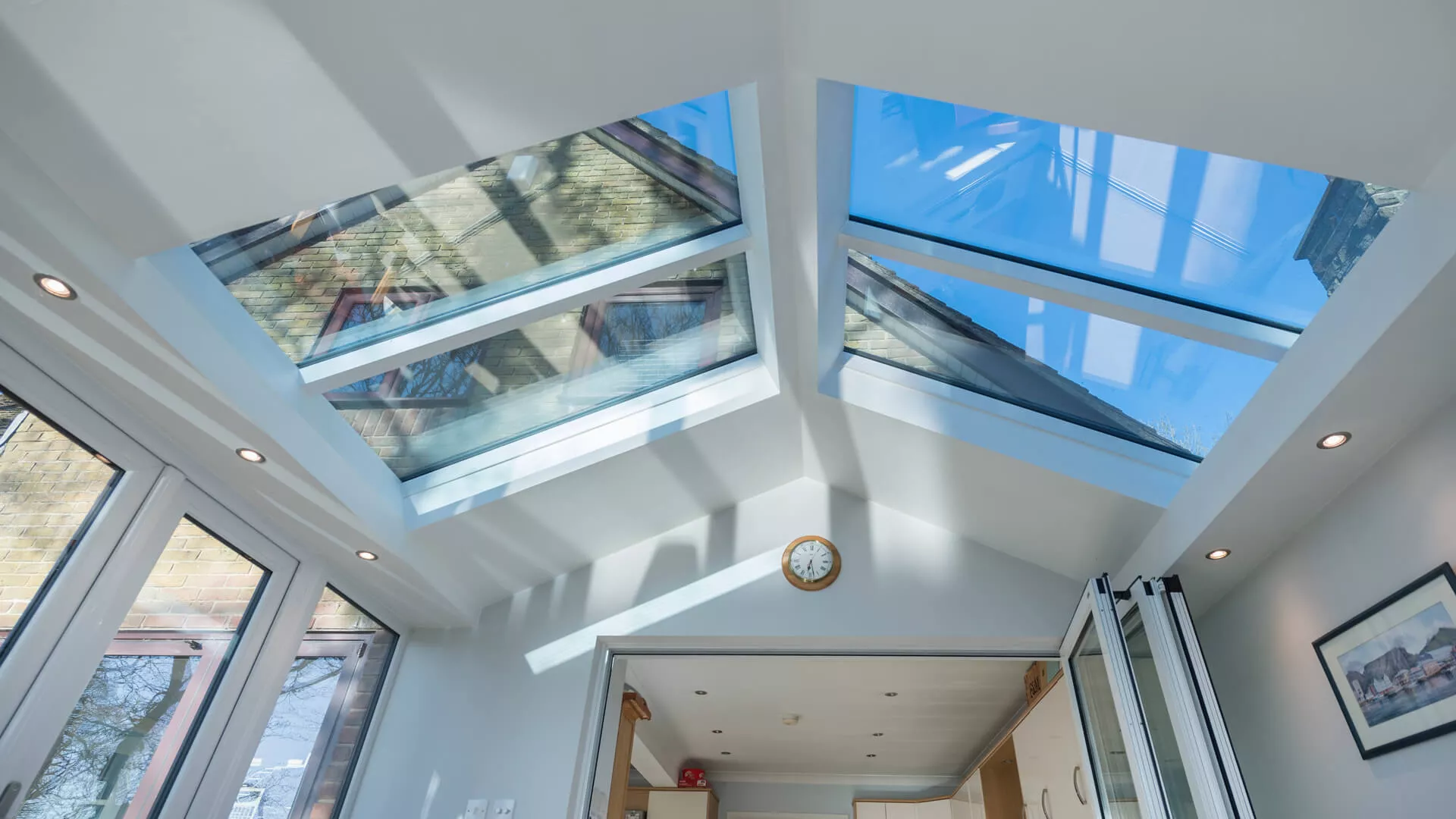 The clean and minimalist appearance of a painted plasterboard internal finish for a replacement tiled roof appeals to a huge number of home extension owners, but there are other possibilities. For something that feels rich and warm we suggest a timber clad ceiling as it has a dark finish that really comes into its own during the winter months in particular. It has an almost ‘cabin-style’ feel and is hugely complementary to any roof windows or centre pivoting timber roof windows incorporated into the design.