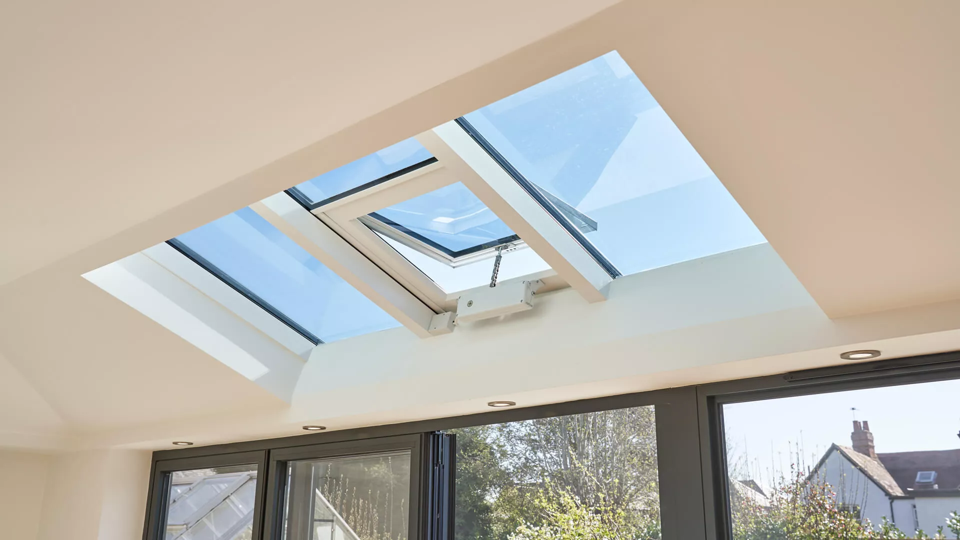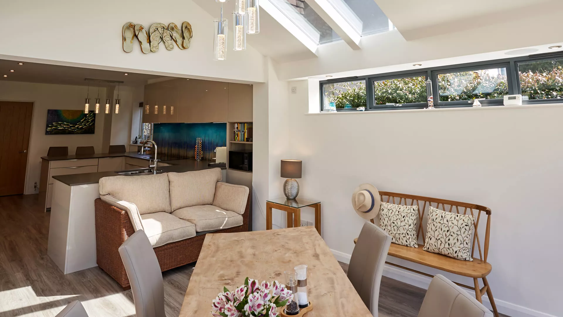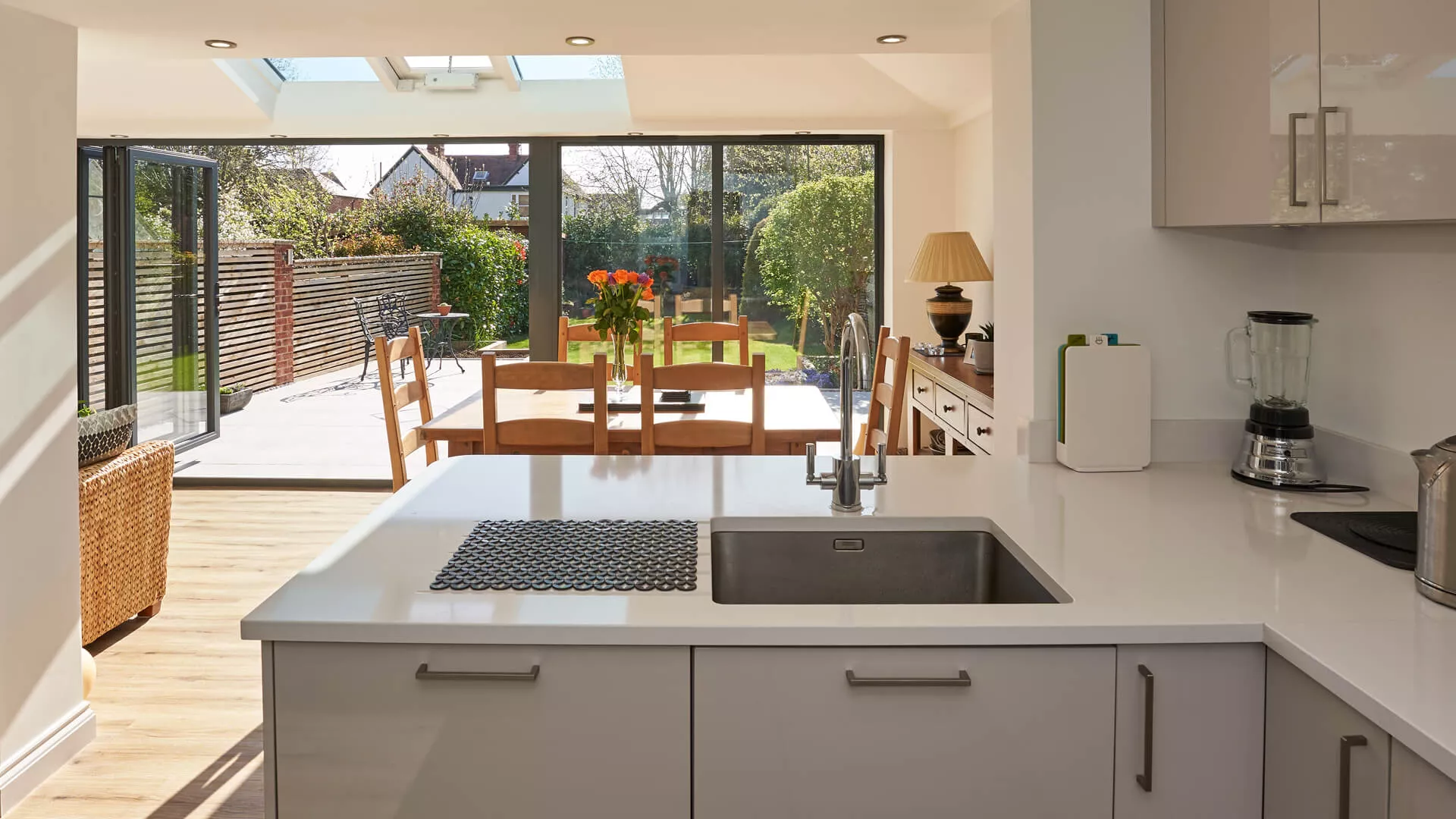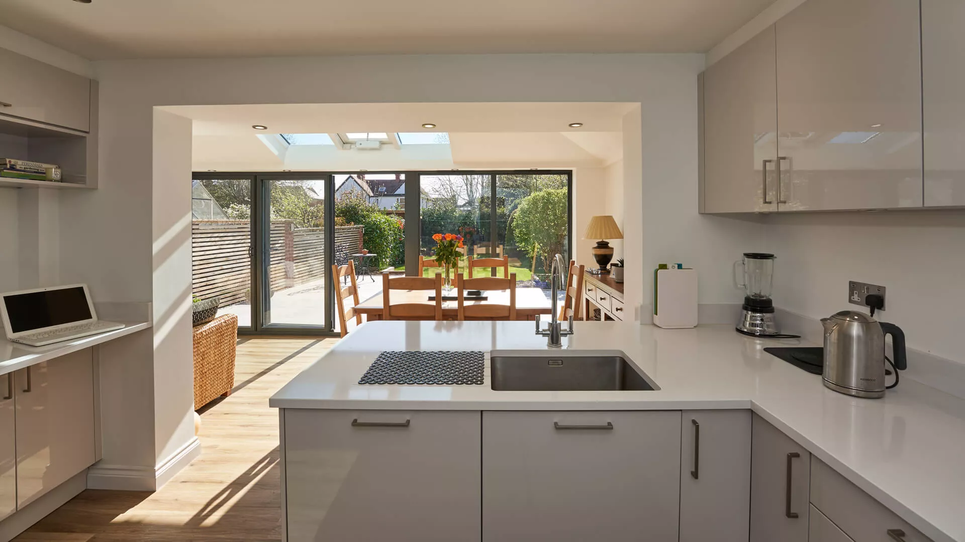 The clean and minimalist appearance of a painted plasterboard internal finish for a replacement tiled roof appeals to a huge number of home extension owners, but there are other possibilities. For something that feels rich and warm we suggest a timber clad ceiling as it has a dark finish that really comes into its own during the winter months in particular. It has an almost ‘cabin-style’ feel and is hugely complementary to any roof windows or centre pivoting timber roof windows incorporated into the design.